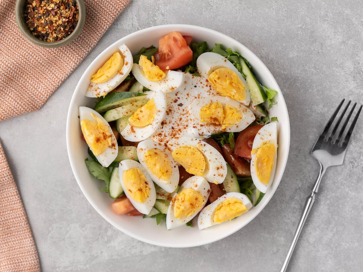 Салат из вареных яиц можно подавать как самостоятельное блюдо или в качестве гарнира к основному блюду: мясному или рыбному. Для приготовления вам понадобятся свежие овощи, салатные листья и натуральный йогурт без вкусовых добавок. При желании йогурт можно заменить сметаной любой жирности или майонезом. Ингредиенты: Для подачи: Приготовление: Посыпьте салат красным перцем по вкусу и сразу подавайте к столу. Приятного аппетита!