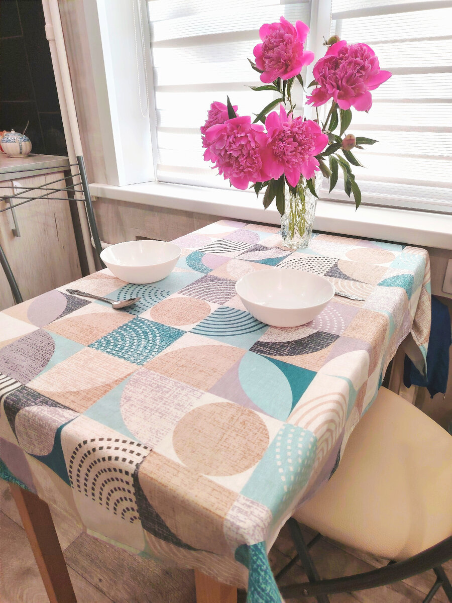 Вот и пришло время рассказать вам, какое же событие вчера мы отмечали 🤗 Но обо всём по порядку. С утра мне захотелось сделать то, что я давно откладывала... Подшила скатерть! Это далось мне не просто, никак не могла катушку ниток найти... В итоге психанула, зашила нитками не в цвет... Ну а сколько можно искать, так и дочка проснулась бы, а при ней я никогда не достаю швейные принадлежности. Даже вышивку забросила на неопределённый срок. В планах навести порядок в своих рукодельных закромах, но это очень долго... Как-нибудь потом. Скатерть в итоге подшила, получилось так: Заказывала скатерть на Вб, пришла с затяжками, но возвращать не стала, уж больно хорошо она в наш интерьер вписывается. Размер был великоват, ну и ладно, остаток ткани пущу на фартук или прихватки. Красивые пионы, да? Это свекровь дала нам, у них возле дома растут. Одни из моих любимых цветов! Ещё свекровь передала нам накануне пирог и конфеты. Вчера же Радоница была - день, когда мы поминаем тех, кого с нами нет 🙏
