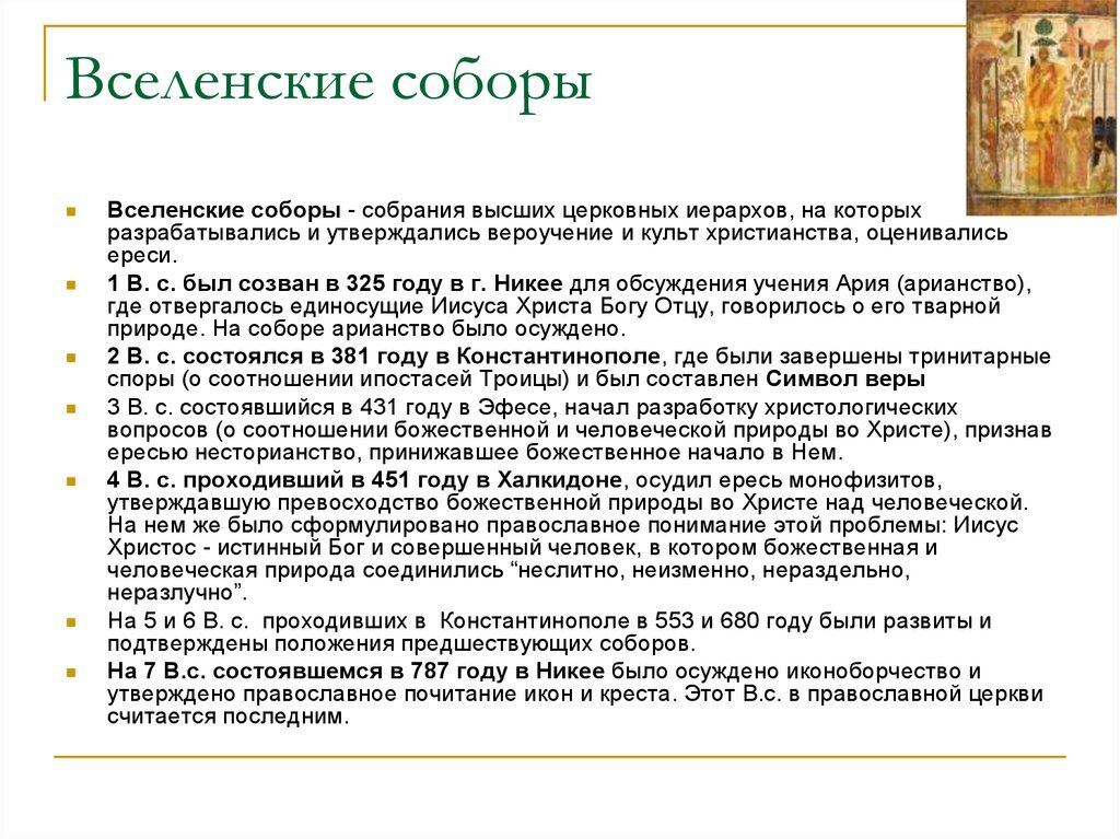 Общими для католиков и православных являются первые семь Вселенских Соборов (в Католической Церкви Вселенских Соборов было более 20): 1) Никейский — 325 г. 2) Константинопольский — 381 г. 3) Ефесский — 431 г. 4) Халкидонский — 451 г. 5) Константинопольский 2-й — 553 г. 6) Константинопольский 3-й — 680 г. 7) Никейский 2-й — 787 г. На чём основана практика созыва Соборов? Традиция обсуждать и разрешать важнейшие религиозные вопросы на принципах соборности была заложена в ранней Церкви апостолами (Деян.15:6). Тогда же был сформулирован главный принцип принятия соборных определений: «угодно Святому Духу и нам» (Деян.15:28). Это значит, что соборные постановления формулировались и утверждались отцами не по правилу демократического большинства, а в строгом согласии со Священным Писанием и Преданием Церкви, по Промыслу Божию, при содействии Святого Духа. По мере развития и распространения Церкви Соборы созывались в самых разных частях ойкумены. В подавляющем большинстве случаев поводами дл
