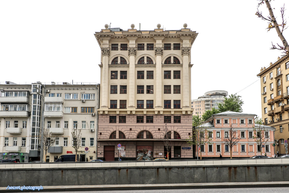 Это будет совсем короткая и, наверное, немного странная заметка. В ней я покажу сразу два дома, чего не делал уже давно, учитывая, что эти дома никак не связаны между собой – за тем единственным исключением, что расположены почти вплотную друг к другу. Недалеко от пересечения Новинского бульвара с Новым Арбатом, над началом транспортного туннеля, стоит узкий, но высокий каменный дом. С рустованной нижней частью и самым что ни на есть классическим, как по учебнику, простите за тавтологию, обликом в стиле неоклассицизма в своей верхней части. С четырьмя мощными пятнадцатиметровыми коринфскими полуколоннами и полуциркулярными окнами предпоследнего этажа, которые превращают пространство между полуколоннами в подобие высоких арок. С массивным карнизом и неким подобием аттика, увенчанного шарами на постаментах. Честно говоря, рассматривая его, я был уверен, что это если не доходный дом начала прошлого века, то уж точно образец архитектуры не позднее его середины. Уж никак не моложе Дома сотр