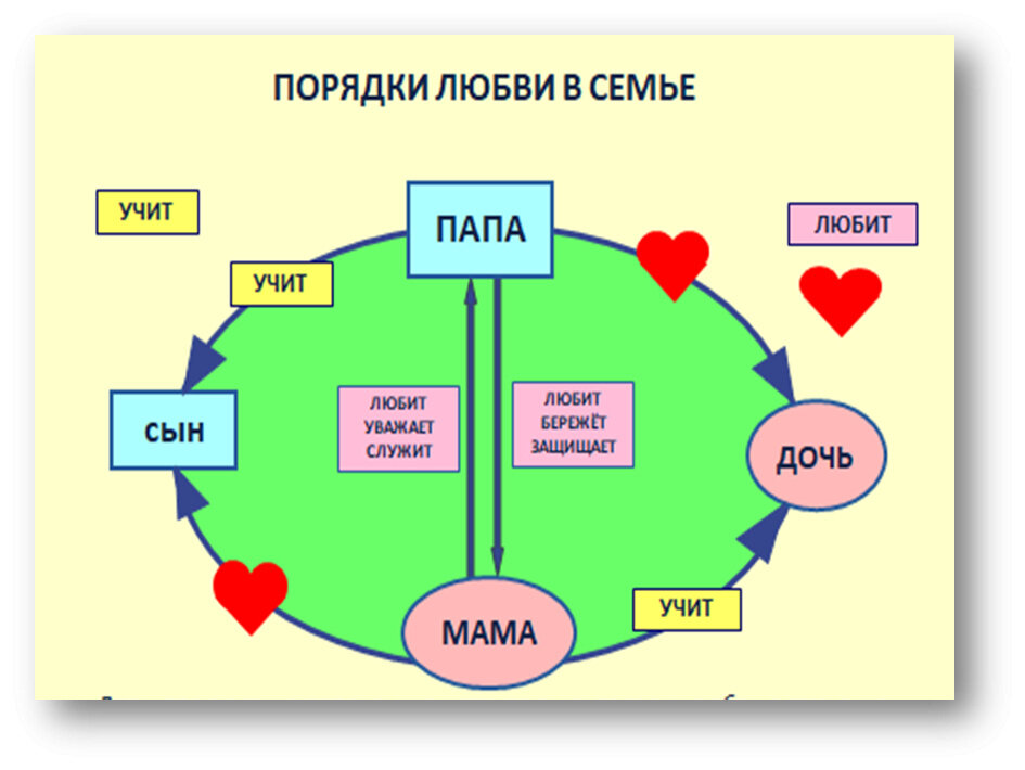 Дети – это плоды любви родителей. Дети, получающие правильные установки на порядки любви, границы личности, ролевые функции и взаимоотношения в родительской семье, при взрослении, как правило, успешны и в личной жизни, и в социализации. Нарушения порядков любви и ролевых функций ведут к запутанным отношениям, несоответствию ролей, занимаемых членами семьи, и, как следствие, к симптоматическому поведению детей.
