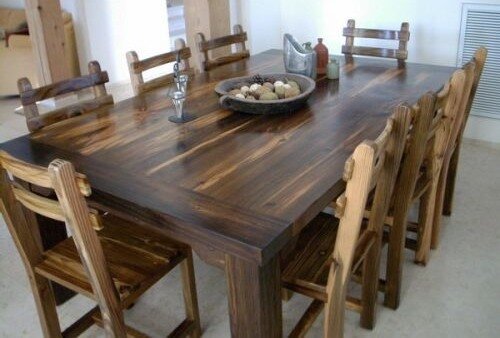 Например, из свилеватых, суковатых сосновых досок получаются очень эффектные столешницы, однако приобретая этот материал, надо тщательно следить, чтобы на дереве отсутствовал брак — выпадающие сучки, червоточины, трещины, неестественные пятна — следы гнили. Перед началом столярного дебюта все детали стола шлифуют, обрабатывают антисептиком. Готовое изделие покрывают морилкой, лаком.