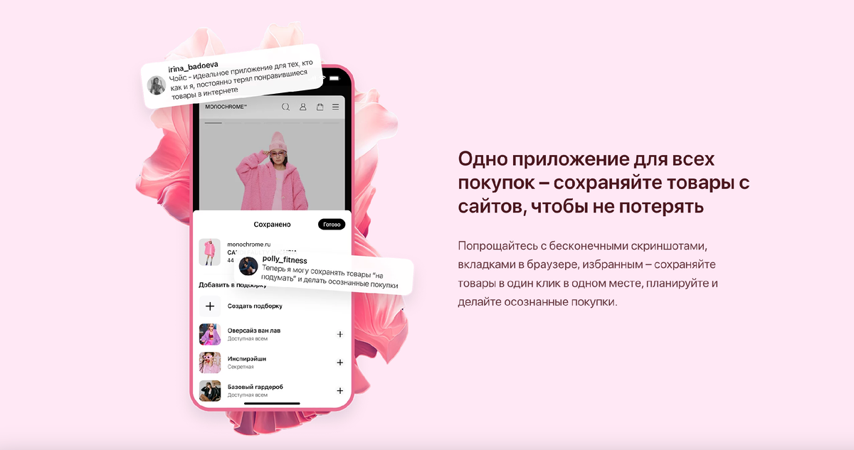 Теперь без проблем можно собирать капсульные коллекции, подбирать интересные решения для интерьера и многое другое. Все ссылки, фото и цены - в одном месте. И все это творение рук нашей суперкоманды - с нуля и под ключ. Функционал Приложение - это удобное хранилище для ссылок на разные товары в интернет-магазинах, в котором пользователь сразу видит фотографию, цену и ссылку на конкретный артикул. Например, девушка подбирает себе новый капсульный гардероб на весну. Заходит на сайты разных брендов: на одном нашла юбку, брюки и сумку, на втором - обувь и верхнюю одежду, на третьем - аксессуары, кардиган и блузки, на четвертом - косметику и так далее. Все ссылки на подобранные товары она сохранила в приложении Чойс, поэтому видит, как сочетаются вещи, и сколько они стоят. Если она не купила все сразу, а вернулась к идее обновить гардероб через неделю - ей уже не надо вспоминать, что где она видела: откуда эта ссылка и с какого сайта та фотография. Все удобно и наглядно расположено в одном