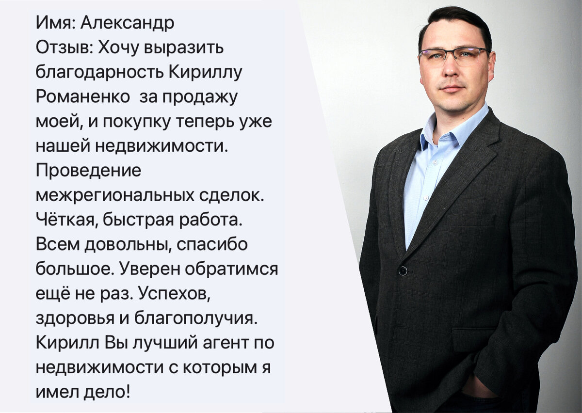 Спасибо за ваше доверие и добрые слова! Если вы хотите написать свой отзыв о моей работе, а возможно и пожелания как могу улучшить качество своих услуг, напишите. продать, купить, обменять недвижимость подготовить и провести безопасную сделку проверить недвижимость перед покупкой или составить договор купли-продажи Ваш личный эксперт по сделкам с недвижимостью +7-920-683-55-52
