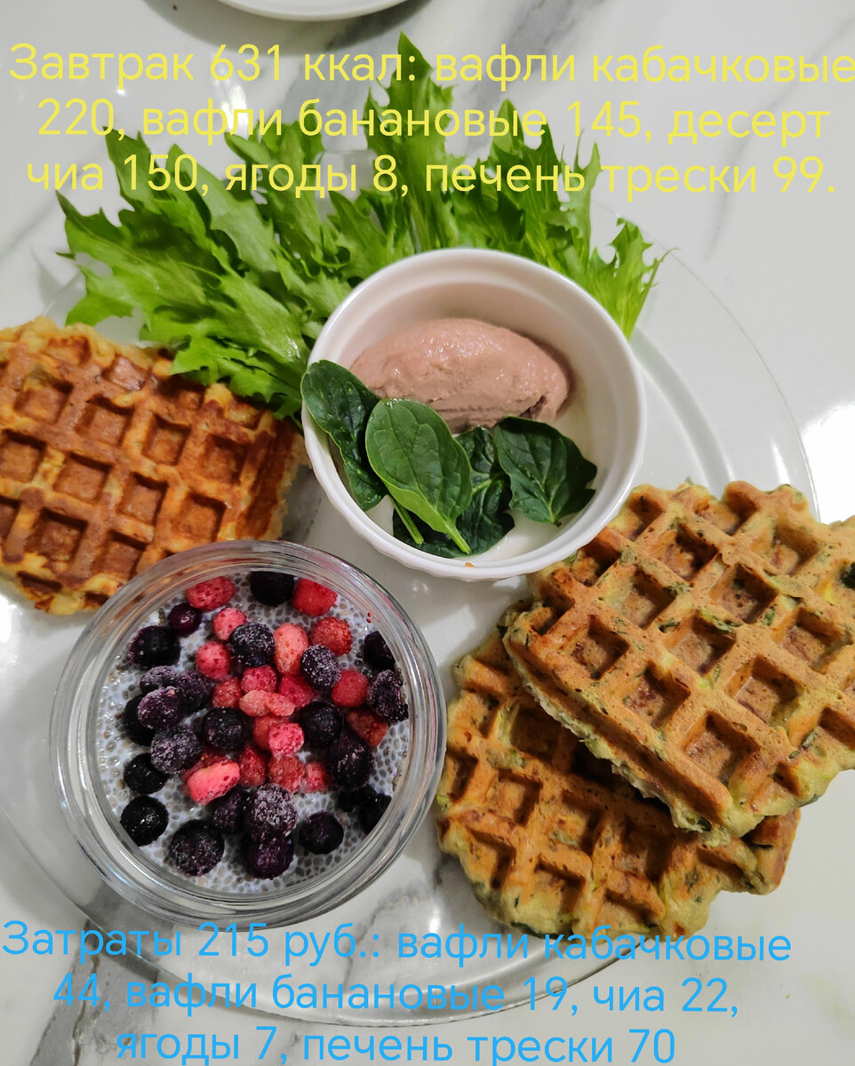 Сегодня на завтрак вафли кабачково-шпинатные на муке из зеленой гречки 2 шт, вафли бананово-яблочные на миндальной и овсяной муке 1 шт., печень трески 25 гр, чиа-десерт с ягодами. Ингредиенты для кабачковых вафель: 100 гр муки из зелёной гречки 150 гр кабачка 20 гр шпината 1 яйцо 100 гр 20% сметаны Соль Кабачок натереть, шпинат порезать, все смешать. Выпекать по 4 мин с каждой стороны. Выход 6 вафель, по 110 ккал и 22 руб каждая. Ингредиенты для десертных вафель: 50 гр миндальной муки 50 гр овсяной муки 1 сочное яблоко 1 спелый банан 20 гр кокосового масла. Молоко (добавить, если сочности яблока не хватит) Яблоко натереть, банан размять, масло растопить, все смешать. Выпекать по 4 мин с каждой стороны. Выход 6 вафель, по 145 ккал и 19 руб каждая.