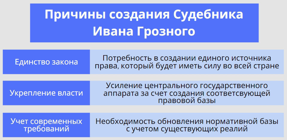 [Sud] Процесс оформления единого централизованного государства в Москве завершился к середине XVI века, при этом великий московский князь начал называться "Государем всея Руси" и обрел почти неограниченную власть на всей территории страны. Для усиления центральных судебных органов и ликвидации судебных привилегий местных князей появился новый Судебник 1550 года. Его создание вызвано несколькими причинами.