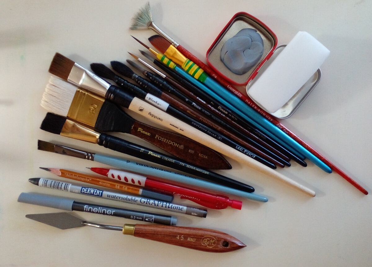 Худо не потому, что магнитная буря продолжается. Куда же от природы деваться. Художественные будни 🖌Для творческого человека важен комфорт. Оборудованное место. Освещение. Отсутствие бытовых раздражителей. Наличие свободного времени и ясной головы. Чтобы спина не затекала. И особенно важно работать качественными и удобными инструментами и материалами. Мне лично очень важно, чтобы кисти, карандаши, линеры и другие приспособления приятно лежали в руке. И просто нравились эстетически. На фото мой основной рабочий набор кистей из синтетики, имитации белки и колонка, веера - щетины, козьего флейца и одной круглой белки-микс: Честно - люблю каждую свою кисточку. Если что-то не устраивает и причиняет дискомфорт, пользоваться не буду. Не смогу. В результате долгого отбора пришла к выводу, что для меня самые лучшие кисти это Pinax (Китай). Большинство любимчиков обычные бюджетные материалы. Из отечественных очень люблю Roubloff и Malevich (полюблю еще больше, когда начнут писать свои названи