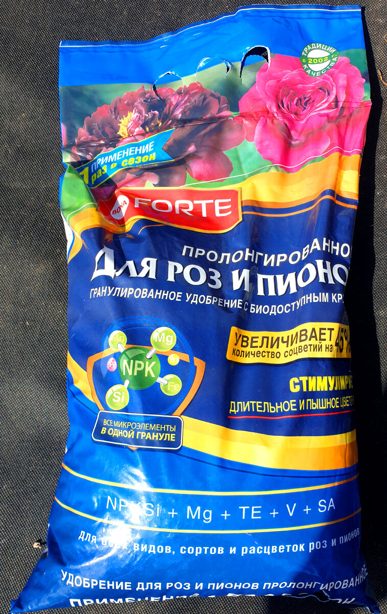 Друзья, сегодня я наконец-то подкормила розы комплексным удобрением. Для меня это поздновато. Обычно эту подкормку я делаю в конце апреля - в начале мая. Но когда были тёплые дни, я занималась рассылкой саженцев роз. Не было даже свободной минуты. Потом пришли возвратные заморозки, и холодная погода затянулась надолго. Поэтому я даже не жалею, что не успела с подкормкой. Когда на улице такие низкие температуры, розы не могут в полной мере усваивать удобрения. Ночи у нас и сейчас ещё холодные. Но ждать уже нельзя. Некоторые розы у меня на бутонах. Если не подкормить. Цветение будет не таким обильным. Это вторая весенняя подкормка моих роз. Первая подкормка была кальциевой селитрой. Об этом можно почитать здесь. А теперь о самом удобрении. Я уже пять лет подкармливаю свои розы удобрением Bona Forte для роз и пионов. Это удобрение пролонгированного действия. Подкормка нужна один раз в сезон. Но моим розам этой подкормки всё же не хватает, и я добавляю ещё одну подкормку. Но об этом будет