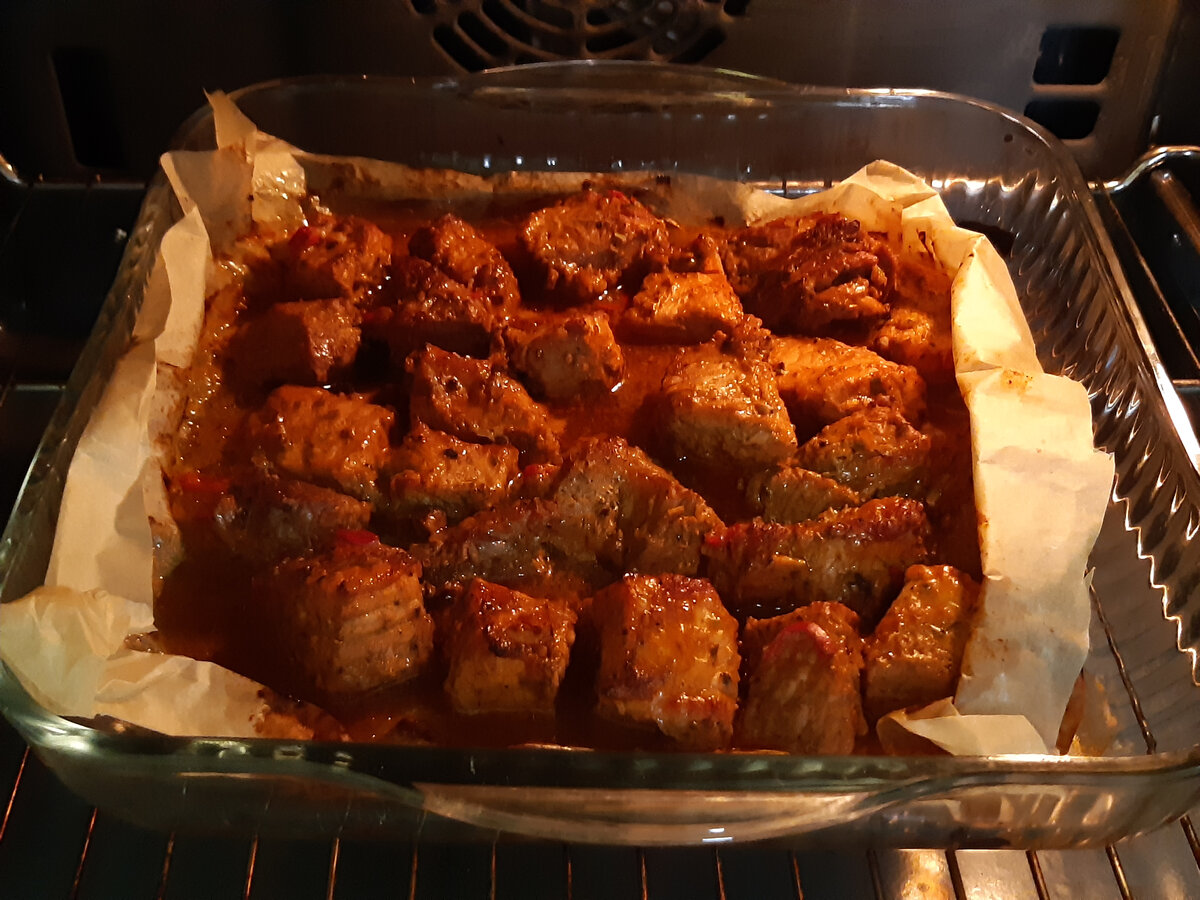 Состав: Приготовление: Мясо режим крупными кусками, как на шашлык. Острый перец мелко режем. Чеснок выдавливаем. Все приправы выкладываем в мясо и хорошо перемешиваем. Оставляем мариноваться на 2 часа. Форму выстилаем бумагой, выкладываем мясо. И закрываем сверху бумагой, подворачивая края. Ставим в духовку разогретую до 200 градусов на 40 мин. Затем достаём и снимаем бумагу с верха. Ставим в духовку и ещё 15 минут. Готово!! Вкус как у шашлыка, правда без запаха дыма… Я подавала с запечёнными овощами. Рецепт есть на моём канале. Приятного аппетита!!