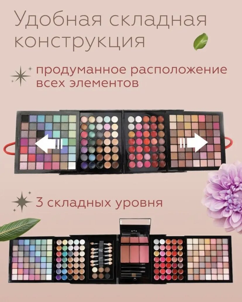 Большой женский косметический набор для макияжа включает 177 цветов разных средств для красоты. Черная коробочка содержит палетки мягких кремовых теней разных оттенков для кожи век, яркие и нюдовые губные помады, базовый тон и основу, цветные румяна и тени для бровей, аппликаторов и кистей, все это в нашем чемоданчике бьюти бокс. Разнообразие палитры теней и помад позволит подобрать идеальные оттенки под цвет глаз и цветотип обладательницы набора. Крутая подборка красивых уходовых beauty - средств для визажа в удобной коробке компактнее чемодана, в ней есть все, чтобы создать шикарный и эффектный макияж женщине для вечеринки, выпускного, свадьбы и любого другого праздничного мероприятия, а также ежедневного макияжа девушке. Артикул 139004616
