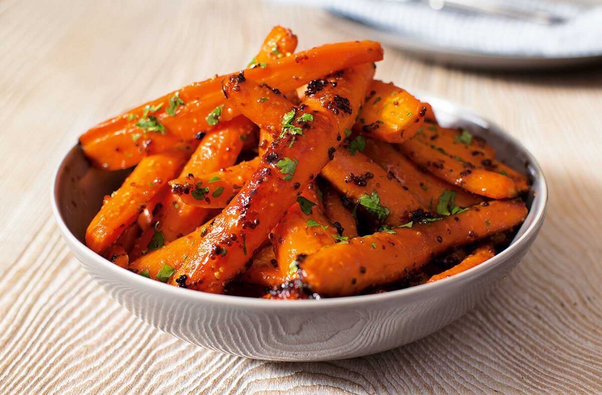 350-400 грамм молодой моркови; 50 миллиграмм оливкового масла; 5 веточек тимьяна; 1,5 чайной ложки мёда; 1,5 чайной ложки лимонного сока; соль, свежемолотый чёрный перец. Тщательно вымойте морковь щёткой и обсушите. Положите в форму для запекания, сбрызните маслом, лимонным соком и мёдом, посолите и поперчите. Поставьте форму в разогретую до 190 градусов духовку на 15 минут, морковь получится хрустящей. Если хотите морковь помягче, то запекайте, прикрыв её фольгой, а затем ещё 10 минут без фольги. Посыпьте морковь тимьяном и подавайте.