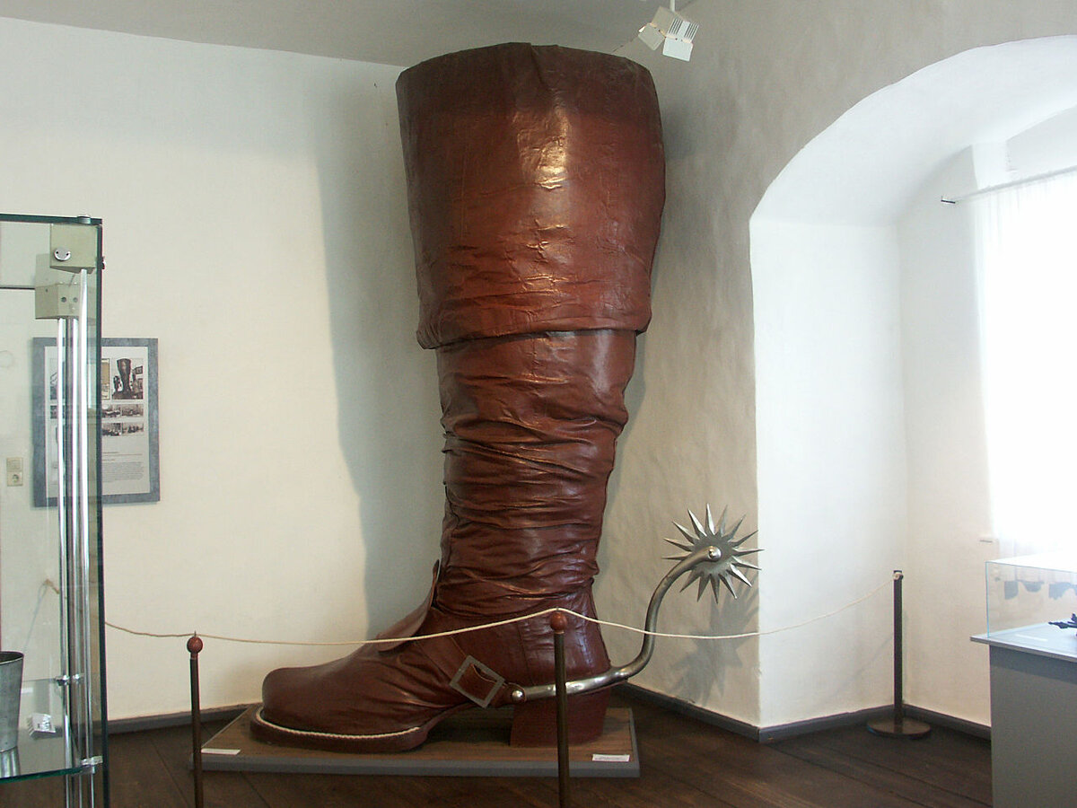 Затем можно было побродить по улочкам и поглазеть на витрины магазинов или сходить в музей , где главной достопримечательностью был огромный сапог, пошитый местным мастером . Этот гигант был сработан в 1925 году по случаю 600-летия Дёбельнского сапожного цеха, обувной фабрики города Лейсниг ( может даже Ляйсниг? ). Высота сапога 3,8 метра, а если выпрямить голенище (сделать это не позволял потолок) – 5 метров. Длина подошвы 1,9 метра, диаметр шпор – полметра. Он был изготовлен рабочим обувной фабрики за 750 рабочих часов. На сапог ушло десять бычьих шкур и девяносто килограммов подметочной кожи.