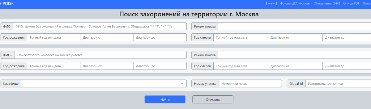Ранее я делал статью о поиске мест захоронений родственников в Подмосковье. Рад сообщить, что теперь и в Москве есть удобный сервис по поиску могилы предка. Рассказываю как найти место упокоения предка. В жизни часто бывает, что по разным причинам связи между людьми со временем теряются. Такое бывает даже между близкими родственниками. Например, умер двоюродный дед, а потомок его родной сестры ничего о нем не знает. Неизвестно даже, где находится могила родича. Теперь найти захоронение родственников в Москве стало проще. Для поиска достаточно знать его фамилию, имя и отчество. Как это работает? У меня была статья про альтернативный поиск предков в московском архиве - сайт е-поиск https://dzen.ru/a/ZIBcSo24o2AUv2ko Так вот, автор этого ресурса добавил на сайт новую функцию для продвинутого поиска захоронений в Москве. 3. Можно уточнить поиск, задав год рождения, год смерти, сведения о людях, подзахороненных в ту же могилу. 4. Жмем меню "Найти" и через несколько секунд получаем резу