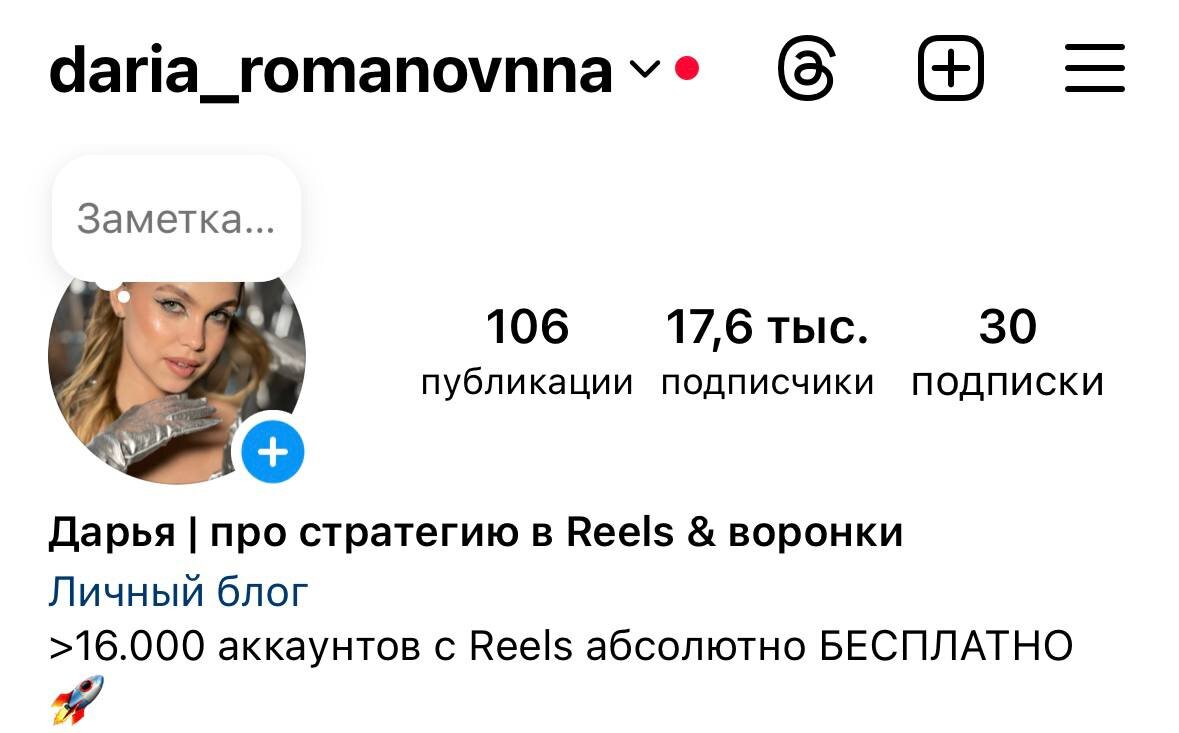 Я Дарья, эксперт и наставник по продвижению через reels. Смогла набрать больше 17500 аудитории не вложив ни рубля в рекламу и обучения, учу других делать крутые результаты и повышать доход с блога. В этом канале я публикую полезные статьи, которые и вам помогут в продвижении через рилс! В моем телеграм канале еще больше пользы про рилс и блогинг, жду тебя! https://t.me/daria_romanovvna Так с чего же начать вести блог?