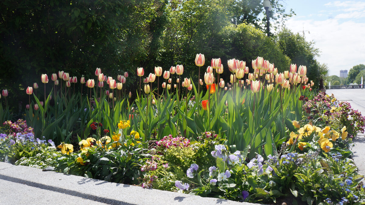 Из-за прохладной весны тюльпаны в этом году цветут долго. И в полном объеме это можно было наблюдать на днях в Парке Горького. Цветение свежее и дружное. При этом рядом уже высажены морозостойкие однолетники.