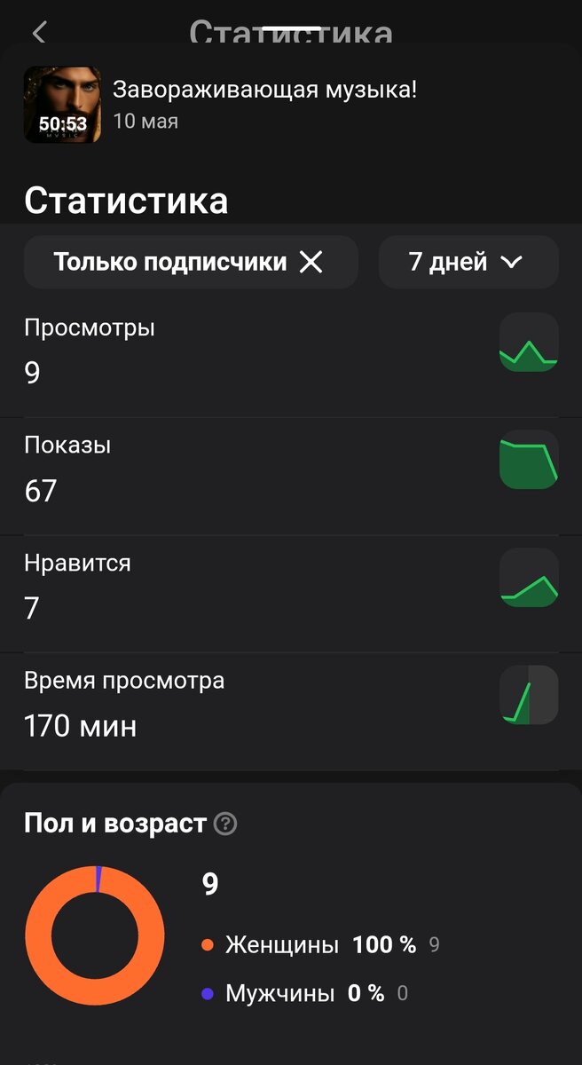 Делал недавно музыкальную паузу на канале. Специально подлинее видео, приятная музыка. Люблю такую под настроение послушать, и когда массаж делаю то включаю её. И знакомых просил послушать. И не только женщин, однако картина такая Да и время просмотра тут 170 минут. А время до монетизации двигается минут по 15-20 в день. Скрин к сожалению не сделал. Печально как то вообщем! Но мы не сдаёмся ! Идём к цели медленно и размеренно! Думаю, рано или поздно мы одолеем тебя, умнейший алгоритм!
