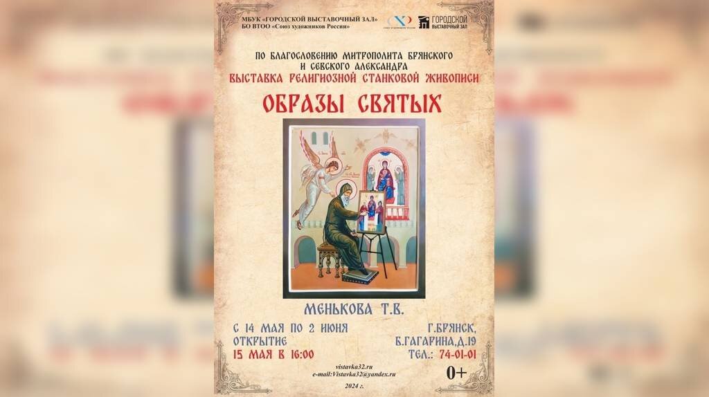 В Брянске открылась персональная выставка иконописи «Образы Святых» Татьяны Викторовны Меньковой, члена СХ России. Мероприятие прошло в Городском выставочном зале в среду, 15 мая. На первой персональной выставке Меньковой Татьяны Викторовны представлено более 40 работ. В представленной экспозиции автор решила собрать и показать весь диапазон своего творчества, а не узко–тематическую направленность. Татьяна Викторовна определила и дала ей широкое название – «Образы святых». Менькова Татьяна Викторовна – родилась 18 января 1989 года в Брянске, в семье художника монументалиста Менькова В.Н. С детства проявляла интерес к рисованию и живописи. В 2009 году окончила Брянское Художественное училище отделение «Станковая живопись» с красным дипломом. На выставке помимо иконописи представлены небольшие пейзажи, тематический натюрморт на военную и мирную темы, а также проект из четырех икон Святителя Николая разных по стилю и времен, но узнаваемому по иконографии. Идея – икона как образ вне време