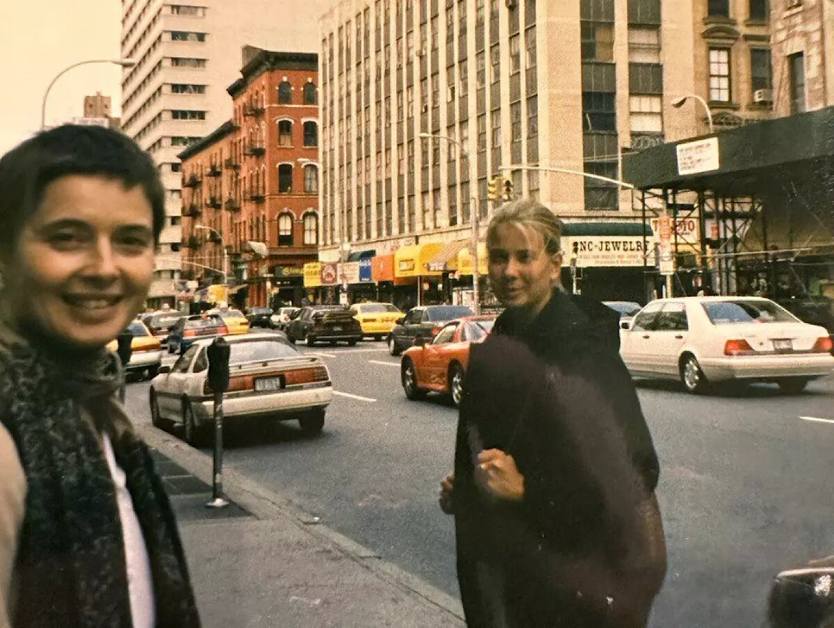Фотографию сделал муж Высоцкой - режиссер Андрей Кончаловский. На снимке Юлия вместе с актрисой Изабеллой Росселлини стоят напротив небоскребов Нью-Йорка (США). Архитектура города, машины и желтые такси делают локацию узнаваемой. Юлия одета в темное пальто и светлые брюки. В руках артистки - коричневая сумка. На Изабелле - черно-серое пальто.