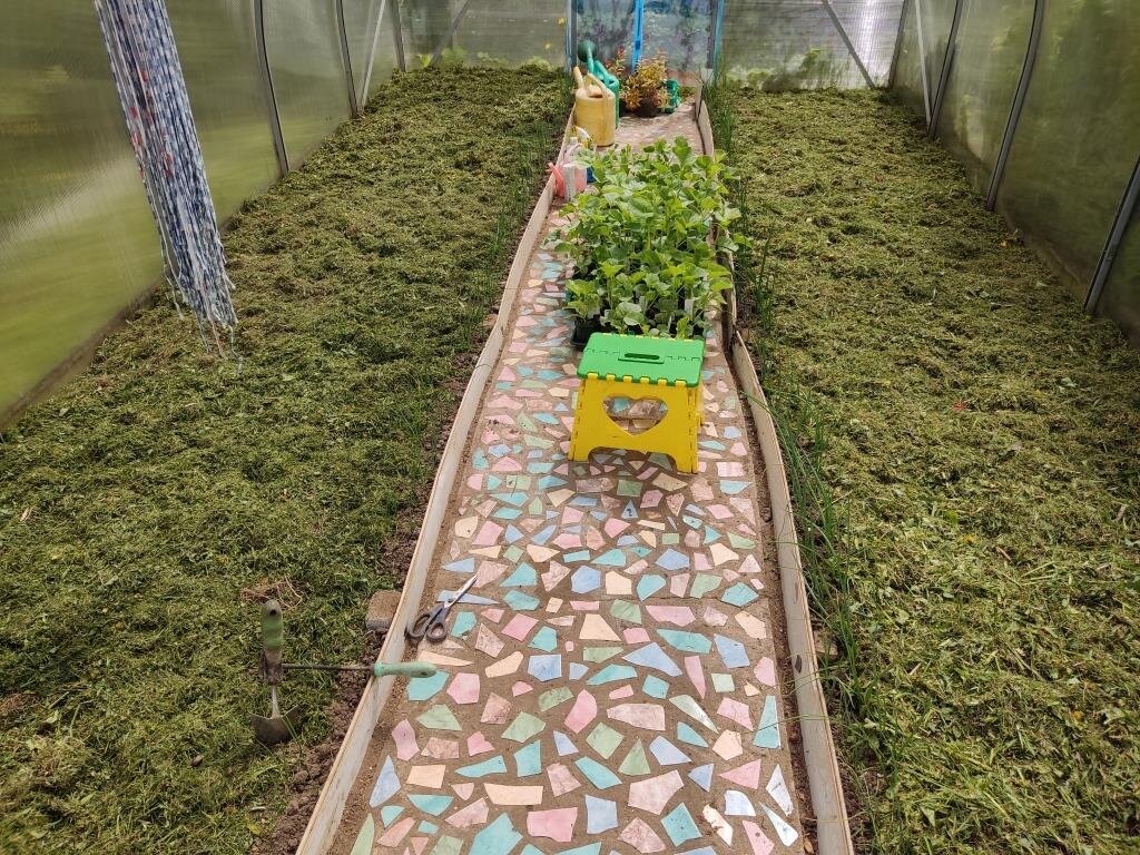 Конечно, летать я не умею, но и землю рыхлую лишний раз топтать не люблю. Поэтому у меня есть в каждой теплице маленькие куски уличных пластиковых панелей. Они плотные и служат вечно.