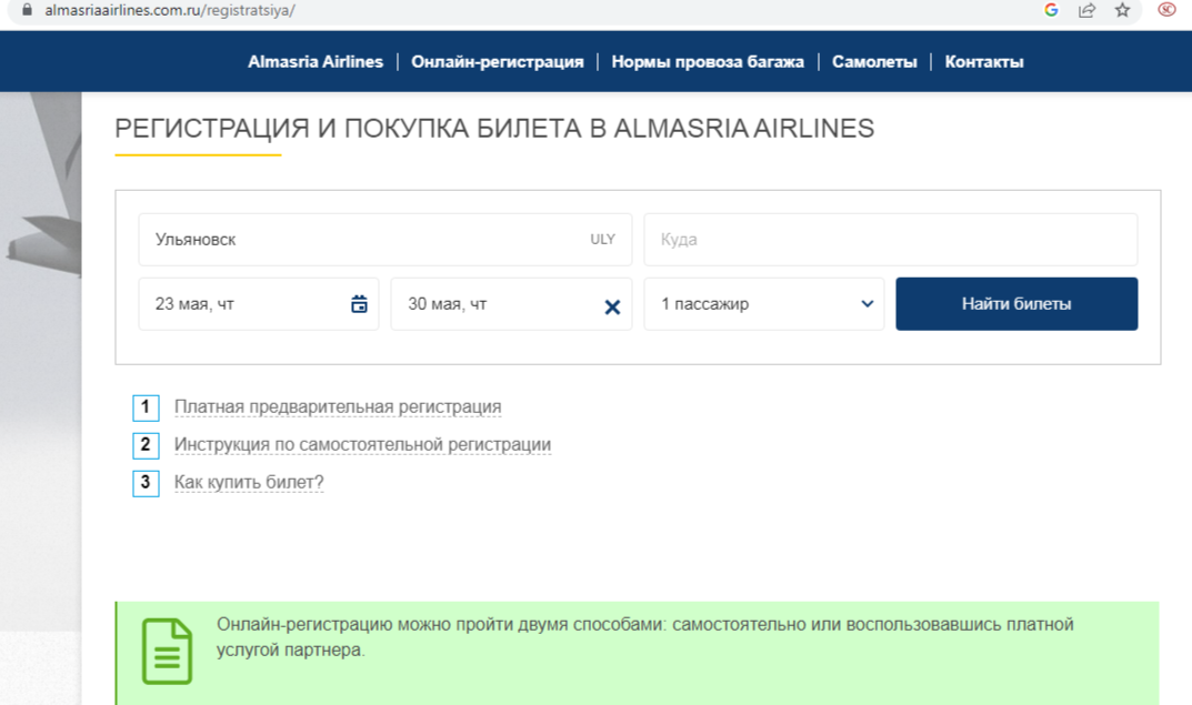 Но они честно перенаправляют нас на официальный сайт авиа компании https://almasriaairlines.com когда мы пролистывем страницу ниже и выбираем графу "Самостоятельная регистрация". Нажимаем "Зарегистрироваться". Если мы нажмем на платную регистрацию - то ничего не случится. Возможно, раньше у владельца сайта, правда, были возможности сделать для вас эту услугу, но сейчас нет.