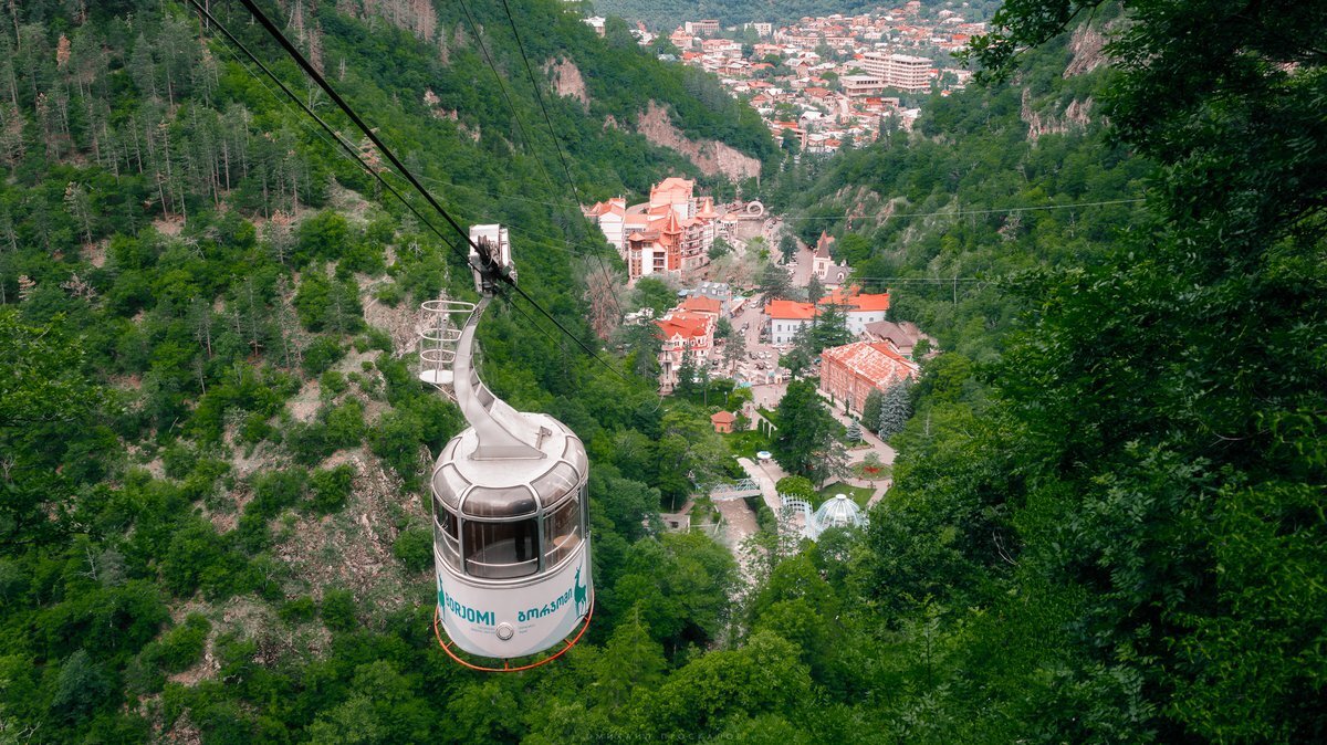 Канатная дорога в Боржоми была введена в эксплуатацию ещё в шестидесятых годах прошлого столетия. С тех пор она практически не изменилась внешне, что для одних минус, а для остальных — возможность прокатиться на ретро-аппарате. О почтенном возрасте свидетельствует только дизайн кабинок, в остальном же канатная дорога регулярно обслуживается, а потому вполне современна и безопасна. Зайдя внутрь, вы вручную закрываете двери, после чего включается мотор и поднимает вас по тросам на высоту 1000 м. В ходе поездки, которая занимает несколько минут, вы сможете насладиться великолепными пейзажами и сделать красивые кадры. Не менее прекрасные виды ожидают вас наверху, где открывается захватывающая дух панорама на горы и укрывшийся среди них Боржоми.