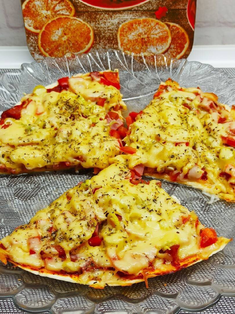 410 ккал /28/16,7/49 1 порция! НАМ ПОНАДОБИТЬСЯ : Листы лаваша смазываем сметаной и посыпаем сыром. Кладем друг на друга. На верхний лист к сметане добавляем ложечку томатной пасты. Все ингредиенты для начинки нарезаем и кладем на лаваш. Сверху посыпаем оставшимся сыром. Ставим в духовку и Запекаем на 180 до расплавления сыра.
