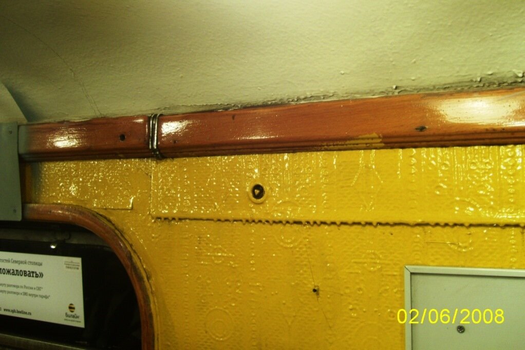 Вагоны типа Е покинули Петербург в 2015 году, но на протяжении ещё пяти лет можно было полюбоваться линкрустом в вагонах типа Ем - более поздней модифиркации серии. Рисунок в них был попроще, если вообще это можно было назвать рисунком, но это всё ещё были тиснёные панели на бумажной основе, покрашенные масляной краской!