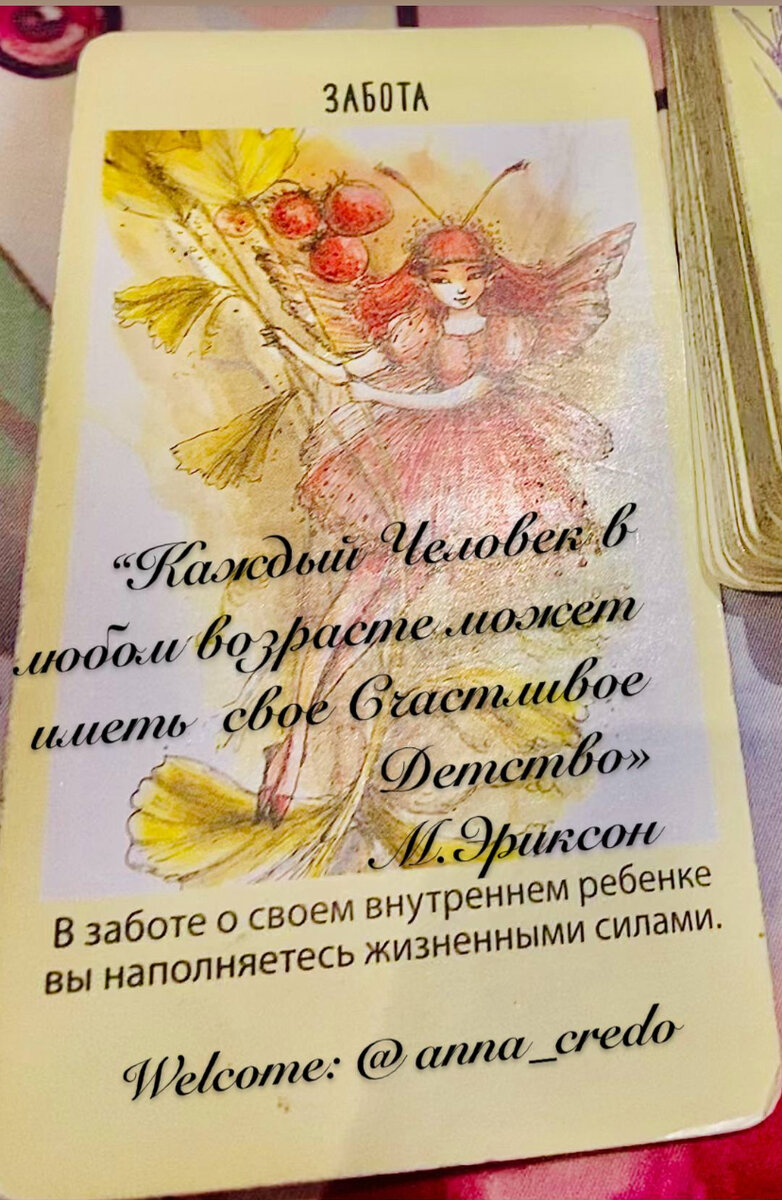 Пусть Будет Хороший день , дорогие ! Каждый день .. Карта дня сегодня напоминает нам о Важном : « Забота о своем внутреннем Ребенке» Вспомните Его .. , его - это себя маленького , свои мечты , свои радости и свои надежды .., не предали ли Вы себя , не Забыли ? Вспоминаем, обнимаем себя , крепко , крепко ( кстати , очень полезная Практика для наполненности) , Любим 💞 и никогда не забываем и будем Бережны с ним , с Собой .. « Каждый Человек, в любом возрасте, может иметь свое Счастливое детство» М. Эриксон.