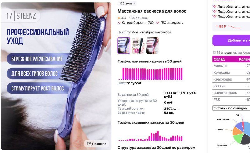 В категории красоты на маркетплейсе каждый продукт стремится завоевать любовь покупателя. При этом инновационные аксессуары для ухода за собой зачастую выходят на передний план — новые решения привлекают большее внимание по сравнению с привычными вещами. Массажная расческа для волос стала одним из таких продуктов и быстро привлекла внимание благодаря своим уникальным функциям. Однако важнейшую роль в успехе кейса сыграло не только качество самого товара, но и способ его продвижения. Рассмотрим кейс с массажной расческой и разберемся, как видео в соцсетях может увеличить продажи. Кейс 255: как визуальное воздействие преобразуется в продажи За полтора месяца видеоконтент с массажной расческой в Instagram* (запрещенная в РФ социальная сеть) собрал 350 000 просмотров и привлек 9 000 потенциальных покупателей на карточку товара. Такая активность привела к 1 300 заказам и выручке в размере 1,1 миллиона рублей. Давайте подробно разберем, какие аспекты кампании оказались наиболее важными. Е