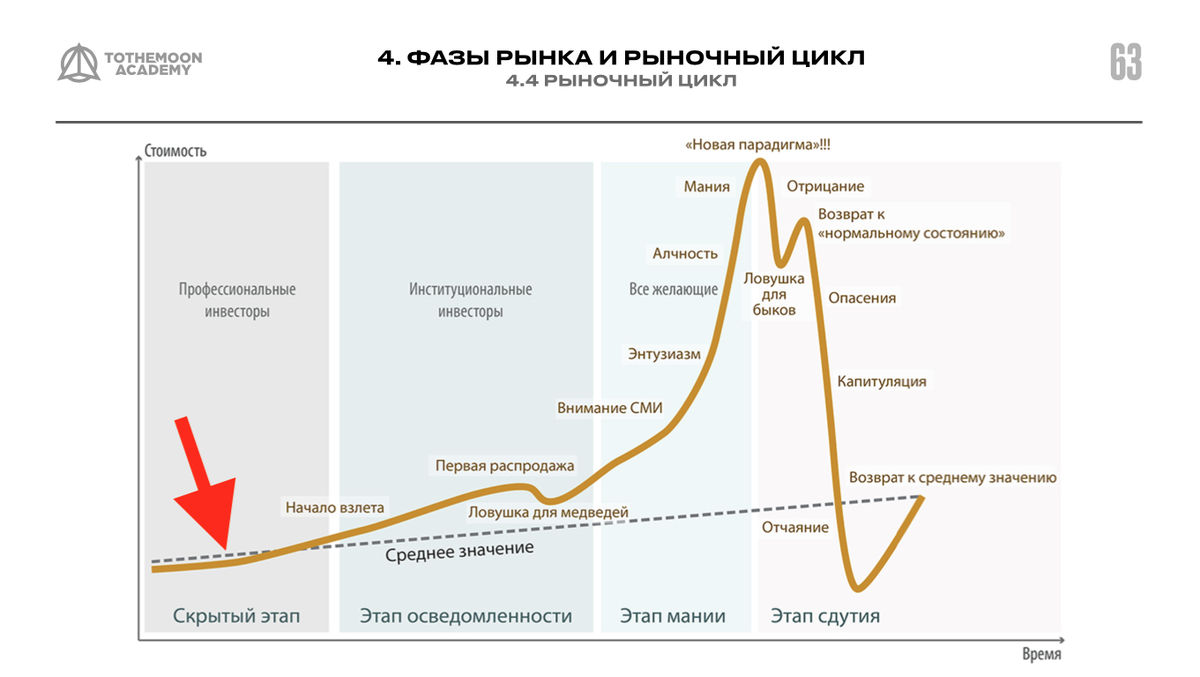 Для понимания идеи дам наглядный график с моего проф. обучения (респект ТoTheMoon Academy!) и отмечу стрелкой, где на мой взгляд мы сейчас находимся по акциям Si14.