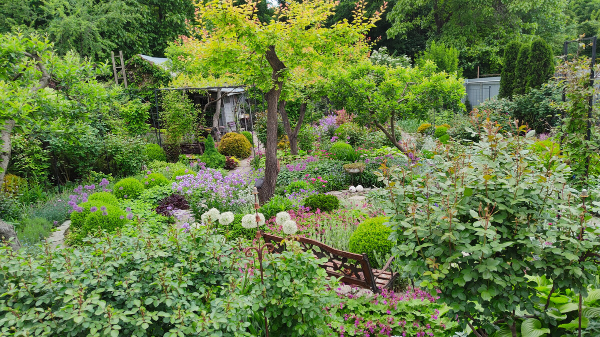 16.05.2024 г. Пятигорск. Розы в бутонах не менее прекрасны, чем в цвету. Они несут надежду и предвкушение красоты. Понаблюдаем за садом в это прекрасное время. Вот так сад выглядит сверху. У входа вся в бутонах роза Кроун принцесса Маргарет, многообещающее зрелище. Вот-вот и все бутоны раскроются, одарив нас красотой. Сегодня пасмурно, лягушки квакают и всё предвещает дождь. В тазу зацвела почвопокровная гипсофила Роуз, я сама выращивала её из семян и всё никак не найду ей место на клумбе. Её бы посадить на какое-то возвышение среди камней или в высокий горшок, чтобы она свисала вниз. Одной из первых раскрыла свой цветок Розариум Ютерзен. Вот так выглядит сегодня Восточный розарий. Все розы нарастили шикарные кусты и утопают в бутонах. Обратите внимание на то, как освежает сад серебристый чистец. Вот фото махрового пиретрума на фоне зелени. А вот тот же пиретрум на фоне чистеца. Согласитесь, что чистец добавил ему красоты. Свой сад я задумывала, как сочетание серебра с пурпуром и это