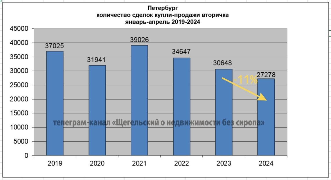 Количество сделок на вторичном рынке снижается. Исключениями были только 2020 и 2022 годы. — АН Бенуа По итогам 2024 года ожидается снижение общего количества сделок на 15-20% по сравнению с 2023 годом. Это может привести к снижению цен на вторичном рынке, но это не прямая корреляция. «Падение продаж является следствием снижения спроса и привлечения внимания к объекту только снижением цены. Нет прямой корреляции движения цен в зависимости от количества сделок, так как есть и другие факторы.» Однако, при снижении количества сделок происходит и снижение цены.