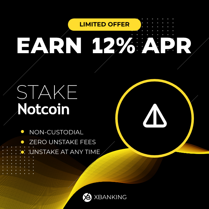 About Notcoin (NOT) Notcoin is a game project in the TON ecosystem that uses the Telegram messenger as a technical platform. The developers offer users a simple “game” that allows them to “mine” virtual coins, which can potentially be converted into tokens. Notcoin offers users to “mine” in-game coins via taps in the mobile version of the Telegram app. For each tap, the user receives one coin and consumes one unit of energy. How much money can I earn staking Notcoin (NOT)? If you place Notcoin (NOT) tokens into staking on the XBANKING platform, you can earn up to 12% APR. Note that the minimal amount for staking is 1 NOT token. How to stake Notcoin (NOT)? If you decide to become a nominator (staker), you need to get a wallet. We recommend using the Tonkeeper wallet.