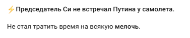 Украинские и оппозиционные каналы тиражируют дезинформацию о том, что визит президента РФ Владимира Путина в Китай провалился. Якобы на это указывает то, что между странами не было подписано никаких важных соглашений, а китайский лидер Си Цзиньпин встретил Путина без должного пиетета.