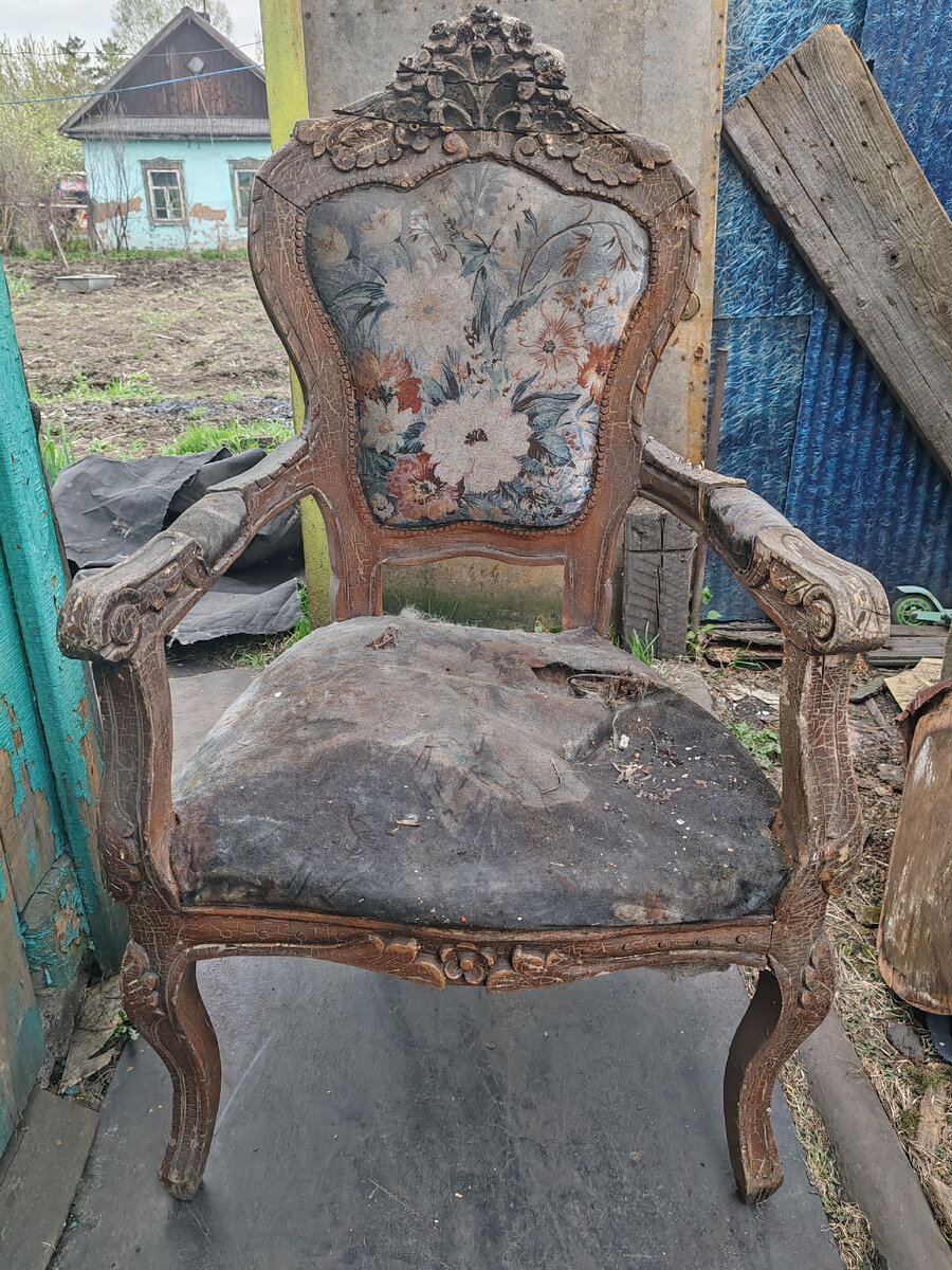 В прошлом году (весной 2023г.) когда мы с сестрой чистили канаву вдоль забора вокруг маминого участка, мы нашли стул. Старый антикварный стул. Дальше по улице стоит мусорный бак и этот стул возможно несли туда, но не донесли, а стул довольно тяжелый. Стул был красивый, но вид был ушатаный, и "конек" на спинке был отломлен мы его запчасти нашли рядом. Сестра рассуждала, что его можно отреставрировать и будет красота. Так-то оно так, если же конечно...... Но где найти реставратора, да и стоить его работа будет скорей всего немалых денег, т.к.стул мягко говоря выглядел не очень. Ну, а сами мы естественно никогда таким не занимались и у нас нет нужного инструмента и умений. Есть только инструмент с помощью которого можно сделать дрова с этого стула. 😆 Так этот стул простоял у нас всю зиму. В этом году я достала его и уж чуть было не сделала из него дрова. Сестра опять стала причитать, что мол жалко и предложила его продать. Тут началось самое интересное. Сфотала я значит стул,
