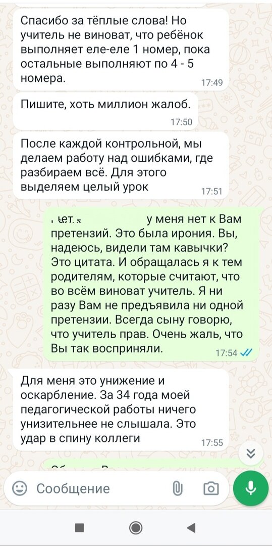 Коллега - это учитель сына. Итак, сегодня я опубликовала пост на своей странице ВК. Сначала он был вот в таком виде. На этой неделе во вторник мои восьмиклассники писали переводной экзамен по математике. Экзамен проходил приближенно к ОГЭ. Я постаралась максимально приблизить: дети писали на бланках, задания брала из сборника ОГЭ этого года. Пробный ОГЭ дети ВСЕГДА пишут плохо. Если в контрольной работе учитель может посмотреть ход решения, и зачесть задание частично за вычислительную ошибку, то на экзамене смотрят только "верно"/"неверно". Мои восьмиклассники меня даже несколько порадовали, есть "пятерки", "четверки", много "троек" "на грани", ошибки все вычислительные: например надо 6,3, а в бланке 0,63 или надо -3, а написано 3. Причем, дети получившие "3" настроены на пересдачу, просят им тоже дать возможность исправить (пересдать можно только двойку). Конечно же я отправила результаты родителям и вот здесь было полное удивление от их реакции. Мне сразу вспомнилась картинка, котора
