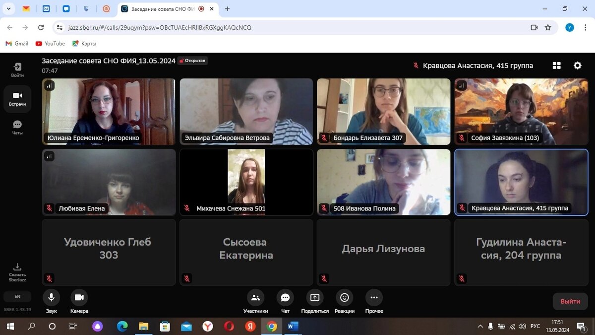 13 мая состоялось очередное заседание Совета студенческого научного общества в 2023-2024 учебном году, в котором приняли участие: заместитель декана по научной работе Эльвира Сабировна Ветрова, председатель Юлиана Еременко-Григоренко, заместитель председателя Екатерина Сысоева, члены СНО: Елизавета Бондарь, Анастасия Гудилина, София Завязкина, Полина Иванова, Анастасия Кравцова, Дарья Лизунова, Елена Любивая, Снежана Михачева, Глеб Удовиченко. На заседании СНО ФИЯ большинством голосов выбрали нового Председателя студенческого научного общества – Софию Завязкину. Также во время встречи члены СНО ФИЯ обсудили результаты учебного года, перспективы дальнейшего развития студенческого научного общества ФИЯ и определили приоритетные направления работы.