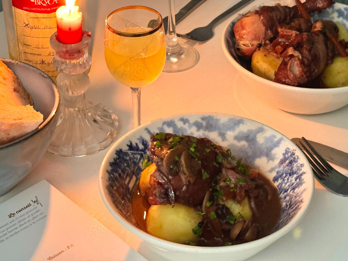 В момент закручивания штопора в пробку, я понял, что содержимое с неприятным сюрпризом. Запах его меня тоже не воодушевил, ну а выпив пару глотков я и вовсе загрустил. Плоский вкус, оно умерло. Но не пропадать же добру? Решено! Готовим бургундское блюдо coq au vin. Или же петуха в вине. Это блюдо готовила моя бабушка. В родной Бургундии. Французская кухня славится тем, что использует вино в рецеп