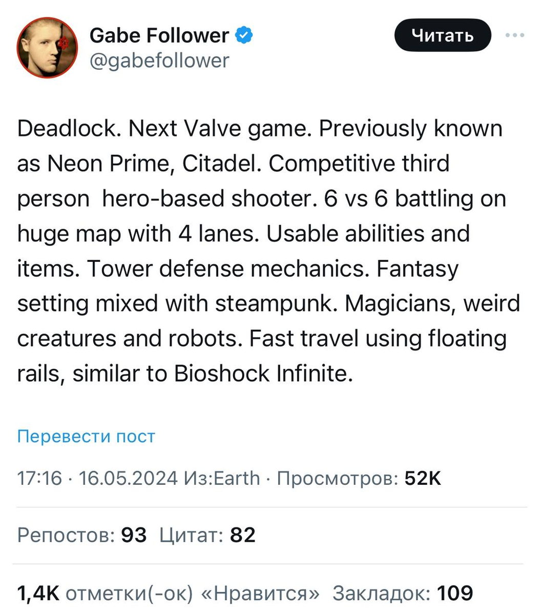 Дата-майнер Gabe Follower обнаружил информацию о следующей игре компании Valve, которой станет PvP-шутер с героями под названием Deadlock. Заявляется, что в сражениях будут принимать команды из 6 игроков, а происходить все действо будет на огромной карте с 4 линиями. Судя по всему, перед нами полноценный шутер в стиле не шутера Dota 2. Инсайдер же говорит, что это будет смесь Dota 2, Team Fortress 2, Overwatch, Valorant, Smite и Orcs Must Die. Как все будет выглядеть пока не ясно. Никакой информации о сроках релиза игры у нас нет, но можно с уверенностью сказать, что (если она действительно существует) ПК-геймеров Valve стороной не обойдут.