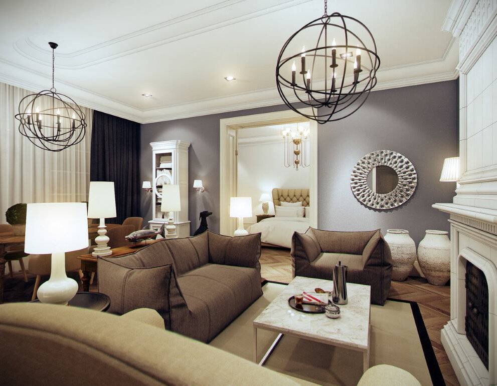 Играя с формой люстры, можно гармонизировать пропорции всего зала. Для квадратных залов подойдут симметричные круглые люстры, а для помещений продолговатой формы можно выбрать асимметричные модели. Если зал сильно вытянут, для него можно выбрать несколько люстр и установить в ряд.