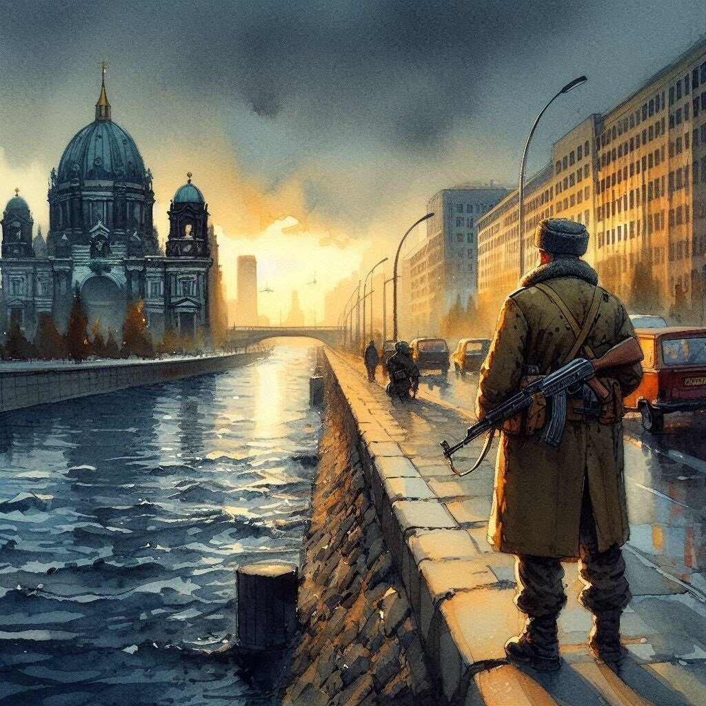 Перекрёсток, на котором я оказался, был похож на тот, который мы захватили, но здесь не было и следа сражений. Вдоль домов стояли автомобили, которых я никогда раньше не видел. Я вышел на перекрёсток, прошёл по улице «Luisenstraße» и вышел к набережной Шпрее. Там я сел на скамейку и решил дождаться утра. Я старался понять, что со мной произошло. Вскоре я заснул, не заметив этого.