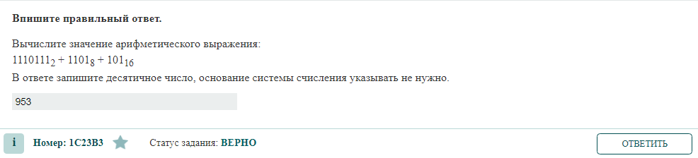 Вычислите значение арифметического выражения: 1110111₂ + 1101₈ + 101₁₆ В ответе запишите десятичное число, основание системы счисления указывать не нужно. ЧТО НУЖНО ЗНАТЬ? Правила перевода из двоичной системы счисления в десятичную Для того, чтобы перевести из 2-й в 10-ю необходимо умножить каждую цифру двоичного числа на основание “2”, возведенное в степень, равную разряду. Например, число 101₂= 1*2²+0*2¹+ 1*2⁰= 4+0+1= 5₁₀. Перевод из восьмеричной системы в десятичную Для этого необходимо умножить каждую цифру восьмеричного числа на основание «8», возведенное в степень, равную разряду числа и после этого сложить полученные результаты. Например, число 101₈= 1*8²+0*8¹+ 1*8⁰= 64+1= 65₁₀. Перевод из шестнадцатеричной системы в десятичную Для этого необходимо умножить каждую цифру шестнадцатеричного числа на основание «16», возведенное в степень, равную разряду числа и после этого сложить полученные результаты. Например, число 101₁₆= 1*16²+0*16¹+ 1*16⁰= 256+1= 257₁₀. РЕШЕНИЕ 1110111₂=1*2⁶+