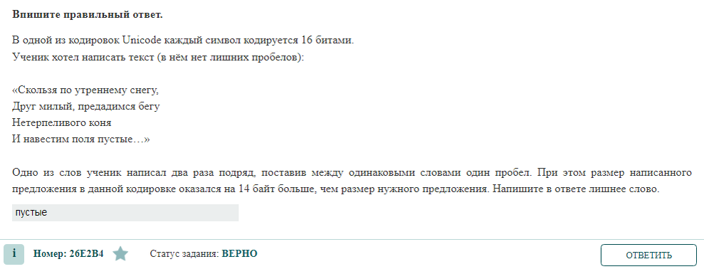 И навестим поля пустые…» Одно из слов ученик написал два раза подряд, поставив между одинаковыми словами один пробел. При этом размер написанного предложения в данной кодировке оказался на 14 байт больше, чем размер нужного предложения. Напишите в ответе лишнее слово. ЧТО НУЖНО ЗАПОМНИТЬ?