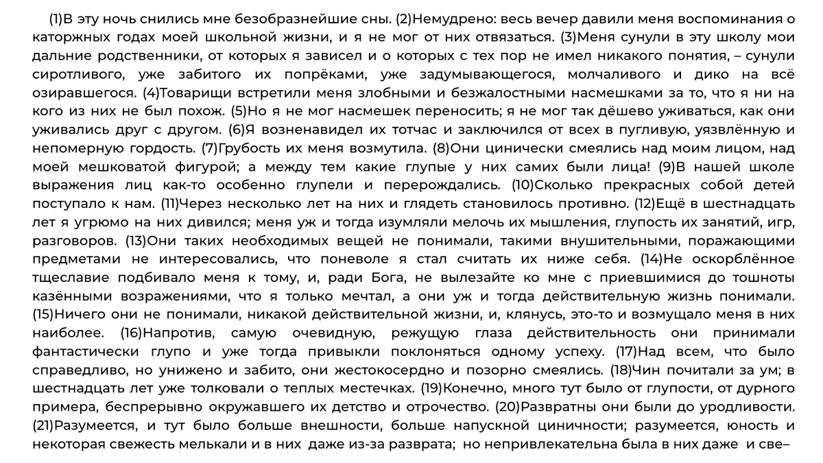 Вариант 27 сборника ФИПИ-2024 (36 вариантов под редакцией Дощинского, Цыбулько) Как среда влияет на формирование личности подростка? Этому вопросу посвящён текст Ф.М. Достоевского, предложенный для анализа. Размышляя о влиянии среды, автор вспоминает «каторжные годы» школьной жизни. Одноклассники встретили сиротливого и забитого рассказчика «злобными и безжалостными насмешками» за то, что он не был на них похож. Героя «изумляли мелочь их мышления, глупость их занятий, игр, разговоров», жестокость по отношению к нему, распущенность, цинизм. Читателю становится очевидно, что школьное окружение относилось к рассказчику враждебно, он не встречал сочувствия и поддержки от сверстников. Далее автор описывает последствия разлада с окружающими. Герой возненавидел одноклассников и «заключился от всех в пугливую, уязвлённую и непомерную гордость». Самолюбивый рассказчик стремился хорошо учиться и стал одним из первых учеников, но после этого между ним и товарищами «установились холодные, натян