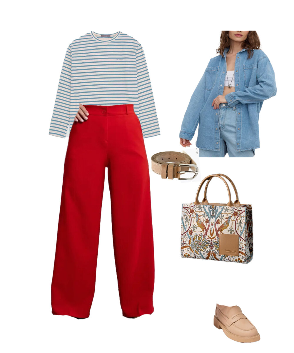 Ой, я такой красоты для девушек с формами натворила. И все образы разные, но каждый очень стильный и интересный. Как обычно, для вашего удобства всё показано с артикулами Образ 1. Это любовь. Мне здесь все по вкусу: тельняшки обожаю, сочетание красного с голубым - в самое сердечко, бежевый и белый их отлично дополняют, на сумку эту давно положила глаз, но пока держусь. В общем, невероятная гармония сотворилась. По фасонам все тоже более, чем удачно: тельняшка с плечевым швом на месте,брюки чуть широкие, но ближе к прямым и достаточной плотности, сумка правильного размера для леди с формами, лоферы на подошве нужной толщины. Артикулы: брюки 160008088, тельняшка 205499012, джинсовая рубашка 219487141, лоферы 153096860, ремень 152090658. Сумку нужную на ВБ не нашла, эта от бренда Two-ta, модель Taylor mini, если нужна большая - есть просто Taylor в такой же расцветке Образ 2 Яркий, с красивым сочетанием голубого и цвета шартрез. Мне захотелось их немного углубляться, поэтому обувь и сум