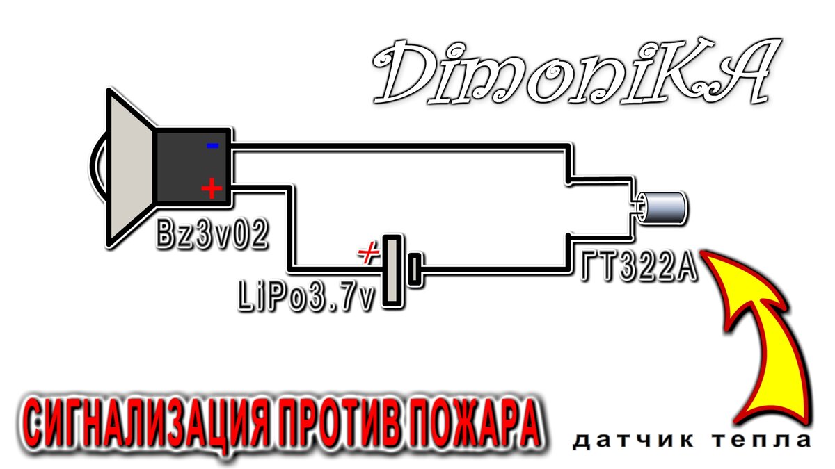 Как известно, многие транзисторы обладают свойствами, которые можно использовать в сигнализации. Для создания пожарной сигнализации вам понадобятся всего лишь батарейка, извещатель и германиевый транзистор. Схема соединения деталей проста - Батарейку, соблюдая полярность соединяем последовательно с извещателем и транзистором ВСЁ (точка). СХЕМА ГОТОВА К ПОЖАРУ И ГОТОВА ИЗВЕЩАТЬ С данным типом транзистора, извещатель включается резко при достижении температуры в сотню градусов. Транзистор пропускает достаточный ток для включения тиристоров или реле, так что можно обойтись без дополнительных схем усиления тока. Такая простая схема способна заменить более сложные устройства выполняющие ту-же роль датчиков температуры и использующих транзисторы в качестве индикаторов тепла. Автор простых схем Компанец Д.А.