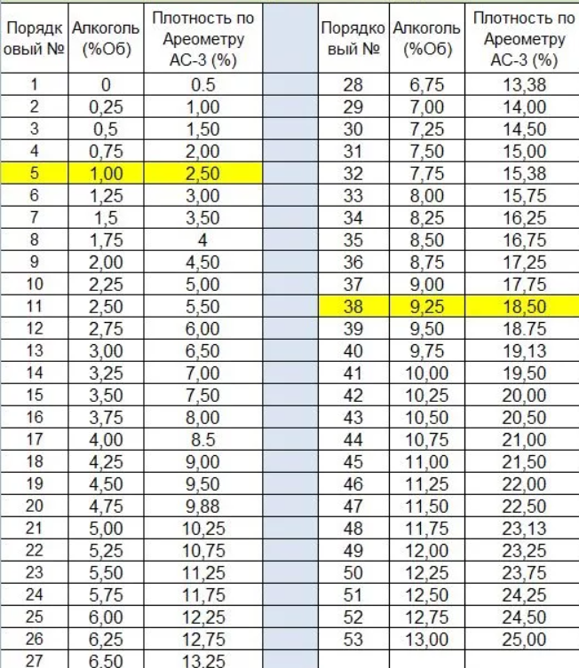 Люди удивляются, узнав, что измерить содержание спирта в браге с помощью спиртометра нельзя, как и узнать крепость вина. Спиртометр — это прибор, который даёт точные данные о процентном содержании этанола только в спирто-водяной смеси. Компоненты сбродившего сусла влияют на плотность браги, делая показания спиртометра недостоверными. Есть два основных прибора для получения достоверной информации: Как получить точные данные о содержании спирта в браге (Сусле) Чтобы получить достоверные сведения о содержании спирта в вине или браге, требуется измерить содержания сахара дважды - до начала брожения и после его окончания. В этом случае, по разнице показаний, несложно рассчитать сколько спирта выработали дрожжи. Для расчета можно воспользоваться таблицей расчета, на основании разности плотности пивног
