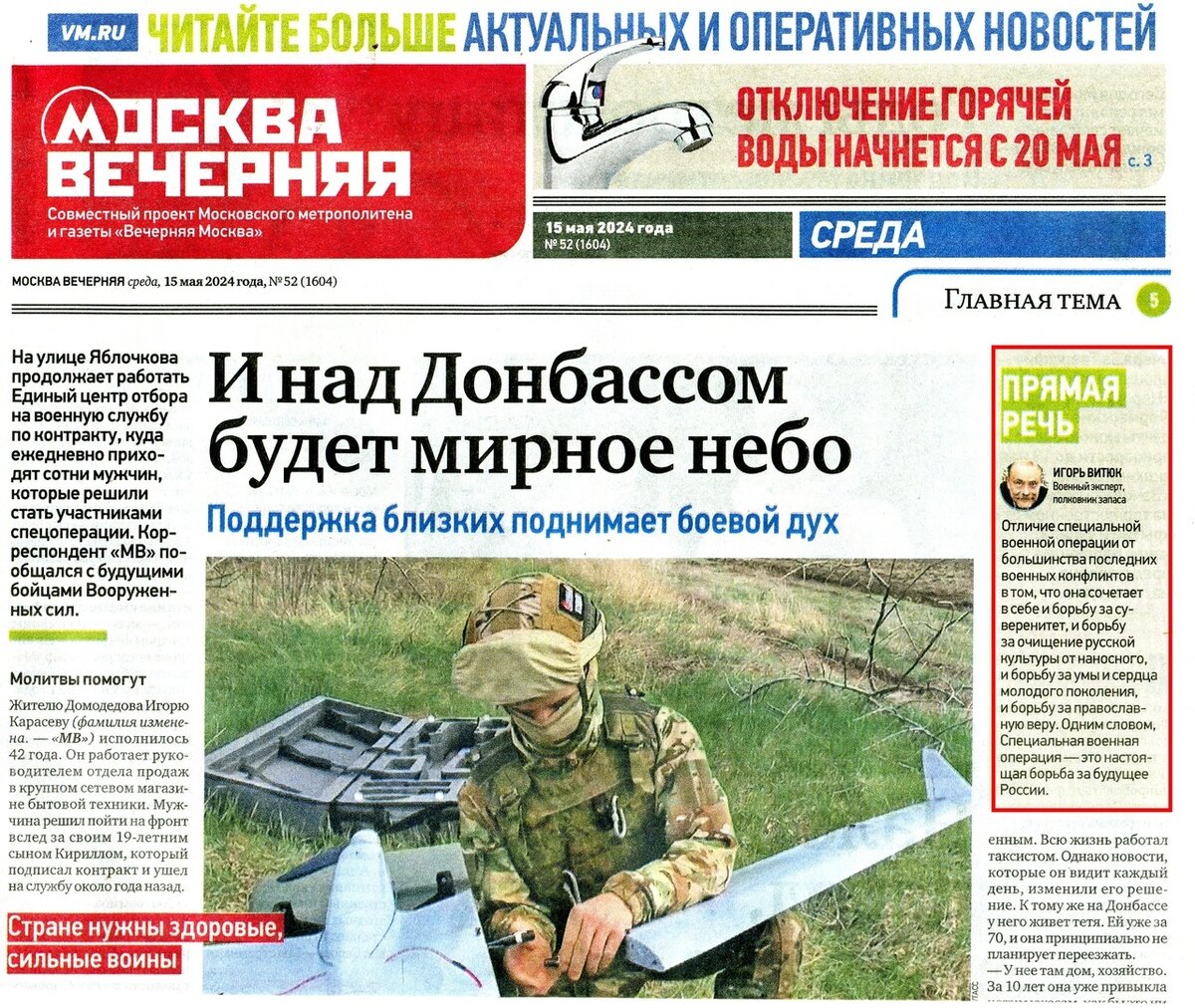 Комментарий главного редактора интернет-журнала «Z-Поэзия», Заслуженного работника культуры РФ, Секретаря Союза писателей России Игоря Витюка опубликован в рубрике "Главная тема" в очередном выпуске ежедневного издания "Вечерняя Москва" №52 (1604) от 15.05.2024 г. (статья Федора Крылова "И над Донбассом будет мирное небо: как поддержка близких поднимает боевой дух").