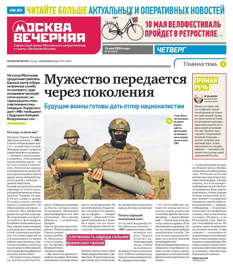 Комментарий главного редактора интернет-журнала Z-Поэзия, Заслуженного работника культуры РФ, Секретаря Союза писателей России Игоря Витюка опубликован в рубрике "Главная тема" в очередном выпуске ежедневного издания "Вечерняя Москва" №53 (1605) от 16.05.2024 г. (статья Федора Крылова "Мужество передается через поколения").