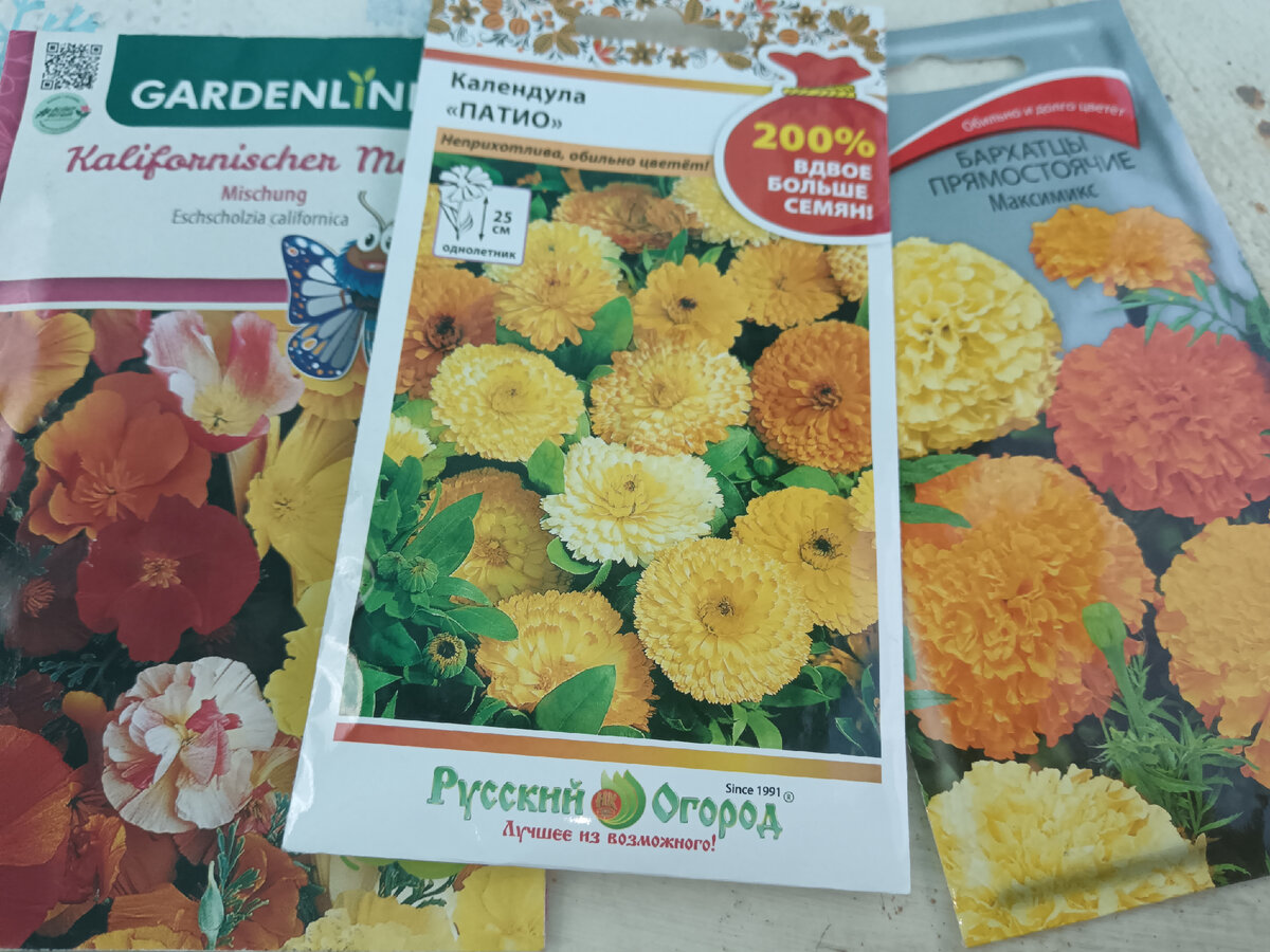 Посередине календула от Русского огорода, на упаковке так и написано, что семян в два раза больше. Так и есть, нормально насыпали, на клумбу хватило и ещё остались, сеяла тоже густо, не экономила.